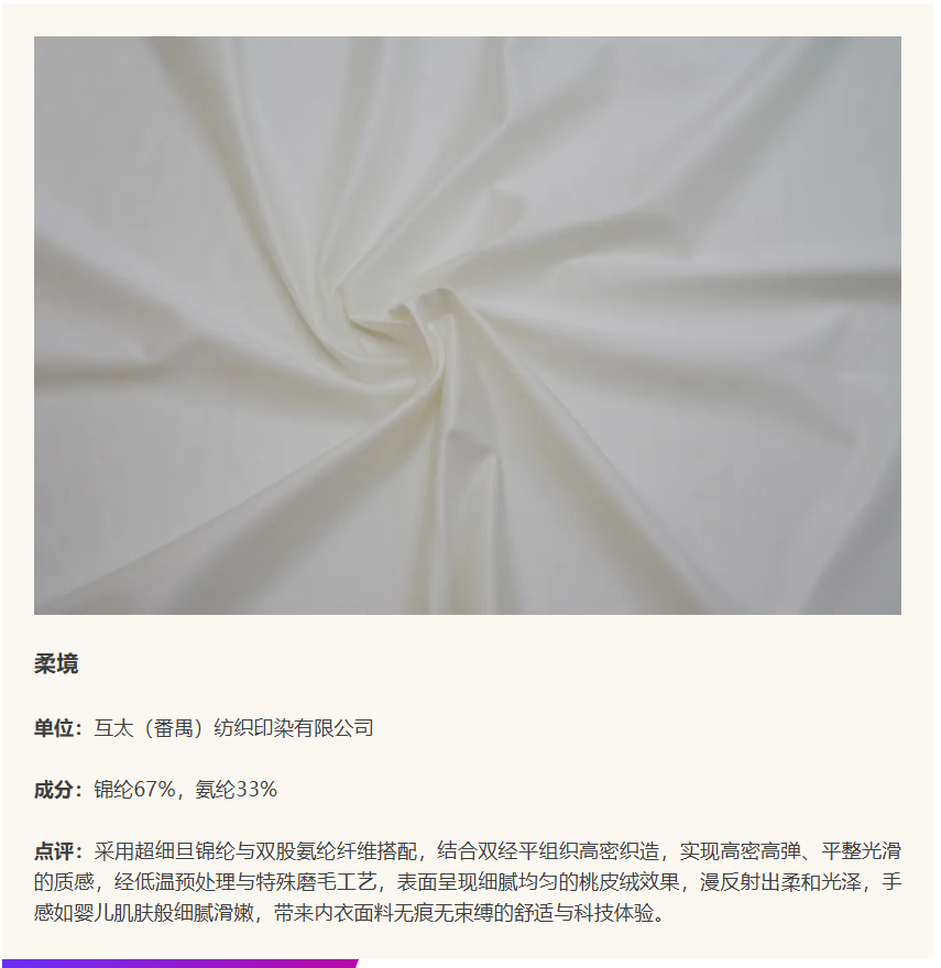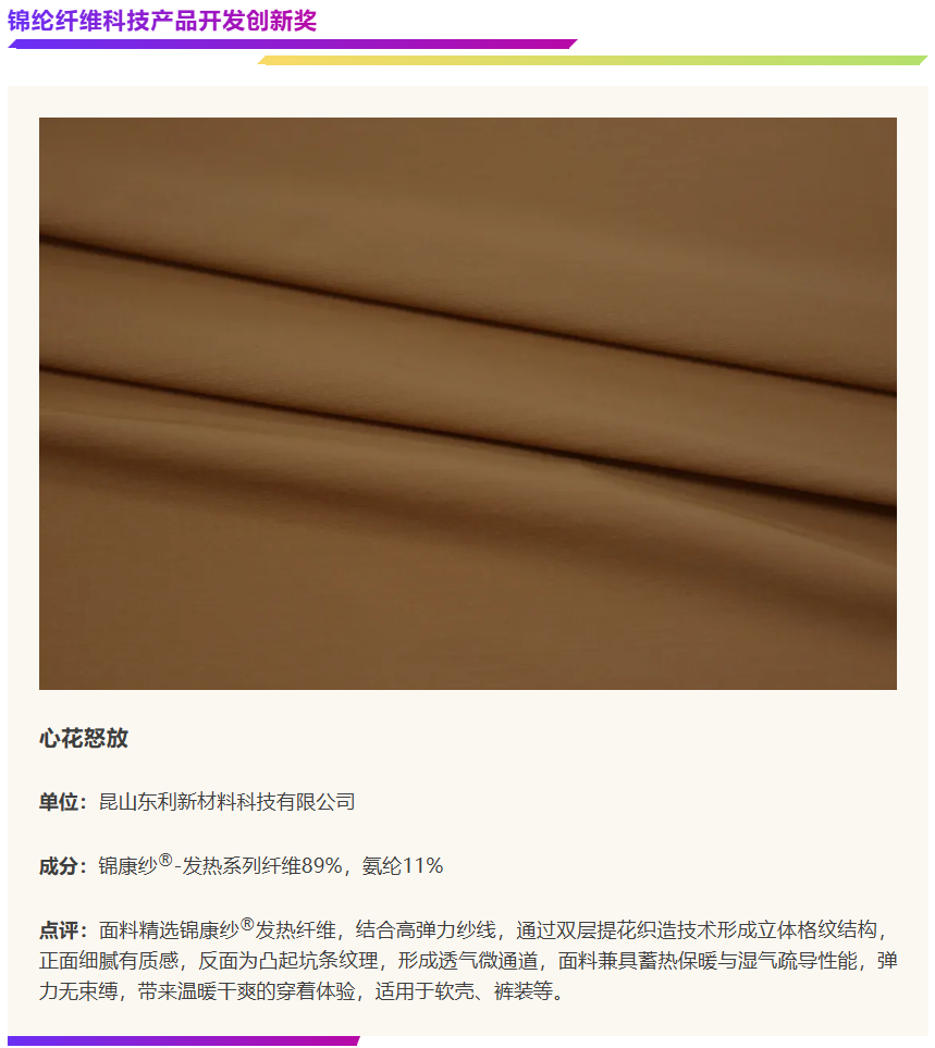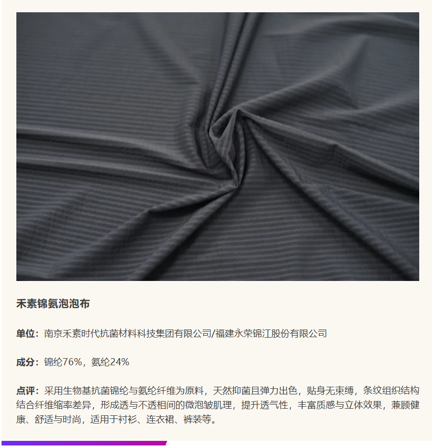 在中国国际面料设计大赛与福建永荣锦江股份有限公司携手设立的“锦纶(永荣锦江)产品开发应用奖”中,锦纶面料在技术创新研发、绿色可持续生产、时尚创新设计等关键维度,展现了锦纶企业的前沿开发实力,为纺织市场注入了无限活力。本期内容将通过解读六款获奖产品,深入探索锦纶在面料开发中的更多创新方向,解锁锦纶应用新可能!