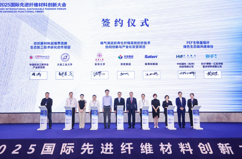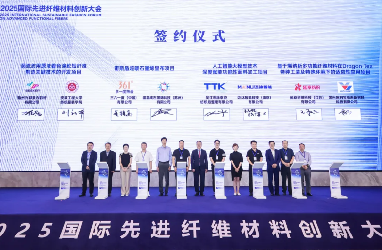 聚焦产业链上下游的协同创新,本次大会举行了11个重点项目签约仪式,覆盖低碳材料研发突破、纺纱技术创新、功能性面料升级、人工智能赋能制造等关键方向。