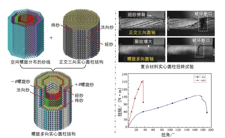 舵轴是航天飞行器中的关键部件。采用传统的正交三向机织结构制成的碳/碳复合材料轴,具有优异的抗弯曲、抗压缩性能,但其抗剪切、抗扭转性能较差,难以满足主承力结构要求。天津工业大学复合材料研究院在正交三向实心圆柱机织结构中创新性地引入空间螺旋分布的斜向纱系统,设计了含螺旋纱的正交多向机织结构,开发了专用的螺旋多向机织装备,制备了该结构增强的复合材料圆轴。扭转测试结果表明,新结构的抗扭能力显著增强:最大扭矩达到210.3 N•m,比正交三向复合材料圆轴提高了1.5倍;在达到此极限扭矩时的最大扭转角为36°,比正交三向圆轴减少了83.3%。螺旋多向/正交三向耦合编织技术的突破,有效克服了传统结构的性能短板,使得复合材料舵轴作为航天飞行器主承力结构的应用具有了广阔前景。