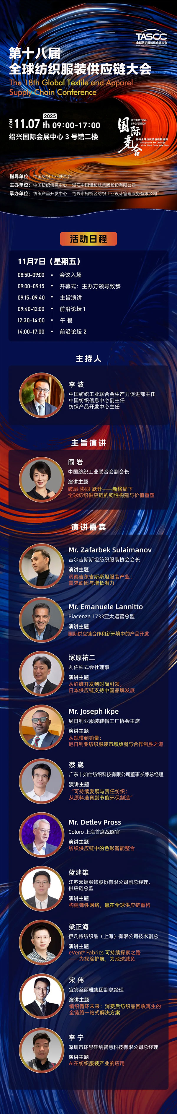 这场汇聚全球智慧的行业盛会,将为全球纺织服装供应链的创新发展注入新活力,推动产业在国际竞合中实现价值链的重塑与跃升。11月7日,诚邀您相聚绍兴柯桥,以国际竞合的战略高度,共览纺织供应链升级新未来!