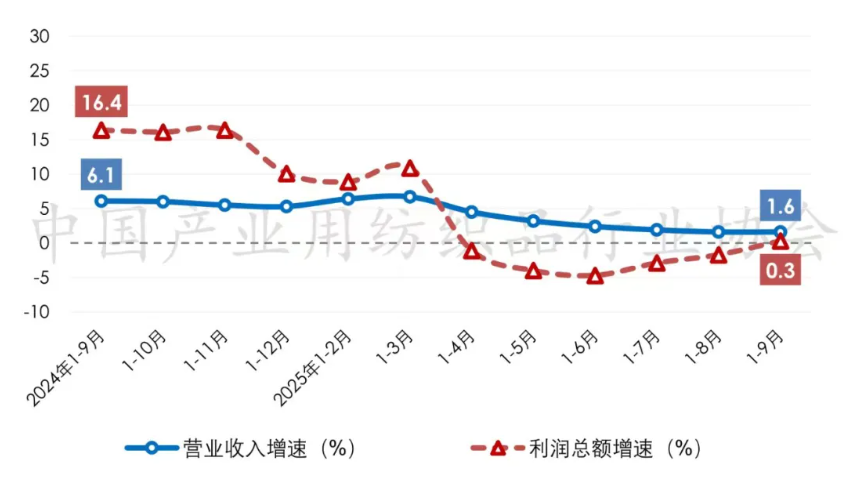 根据国家统计局数据,2025年前三季度产业用纺织品行业规模以上企业的营业收入和利润总额分别同比增长1.6%和0.3%;根据中国产业用纺织品行业协会测算,行业规模以上企业的营业利润率为3.7%,同比下降0.1个百分点;行业亏损面为24.2%,较二季度收窄2.6个百分点。自2025年一季度以来,行业的营业收入增速逐月放缓,利润总额增速再次进入下降通道,行业经济平稳运行的基础仍需巩固。
