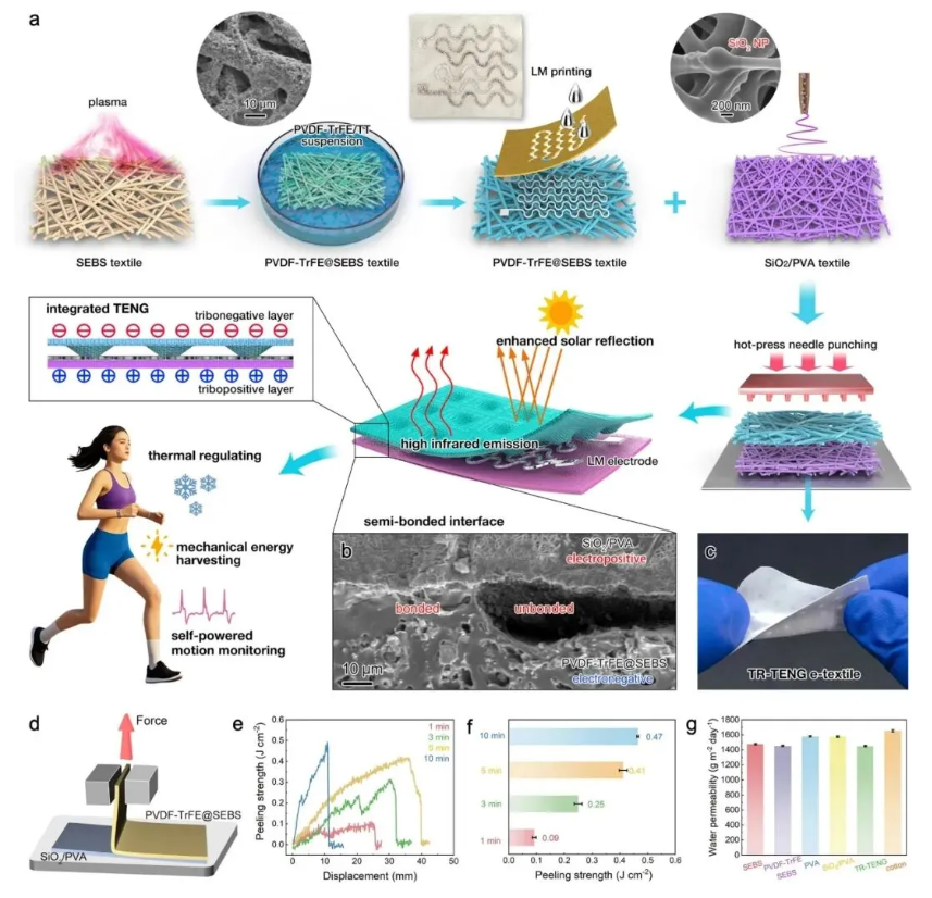 该研究通过半粘合组装工艺,开发出一种双层智能电子织物(TR-TENG),其创新性地整合了两种功能层:一层是负载高太阳光反射/强电负性聚偏氟乙烯-三氟乙烯(PVDF-TrFE)纳米颗粒的SEBS纤维层;另一层是嵌入高红外发射/强电正性SiO2纳米颗粒的PVA纤维层。经过热压针刺复合处理后,织物兼具柔性、透气性与结构稳定性,在保持优异摩擦电性能的同时实现双重热调控功能:增强的太阳光反射与高效的红外发射(图1)。作为贴肤自供电运动传感器,不仅能实现优异的被动辐射降温功能,还能精准识别高频运动(如跑步)和细微动作(如吞咽、呼吸等)。