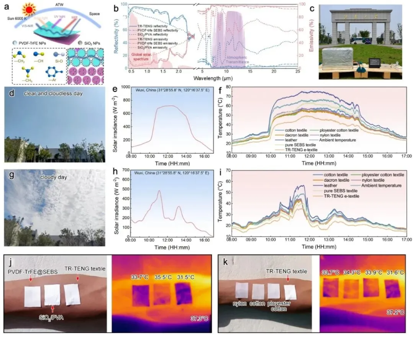 如图3所示,TR-TENG织物展现出83.1%的太阳光反射率,这得益于PVDF-TrFE颗粒与基底材料构建的反射界面;由SiO2增强的PVA纤维赋予了TR-TENG织物出色的红外发射性能(96.2%)。基于此,TR-TENG织物实现了优异的被动辐射冷却性能。在晴朗天气下,TR-TENG织物表面温度相较环境温度可降低最高达18.4 ℃(图3f);在多云条件下,其降温幅度仍可达12.6 ℃(图3i),显著优于尼龙、棉布和皮革等常见商业织物。