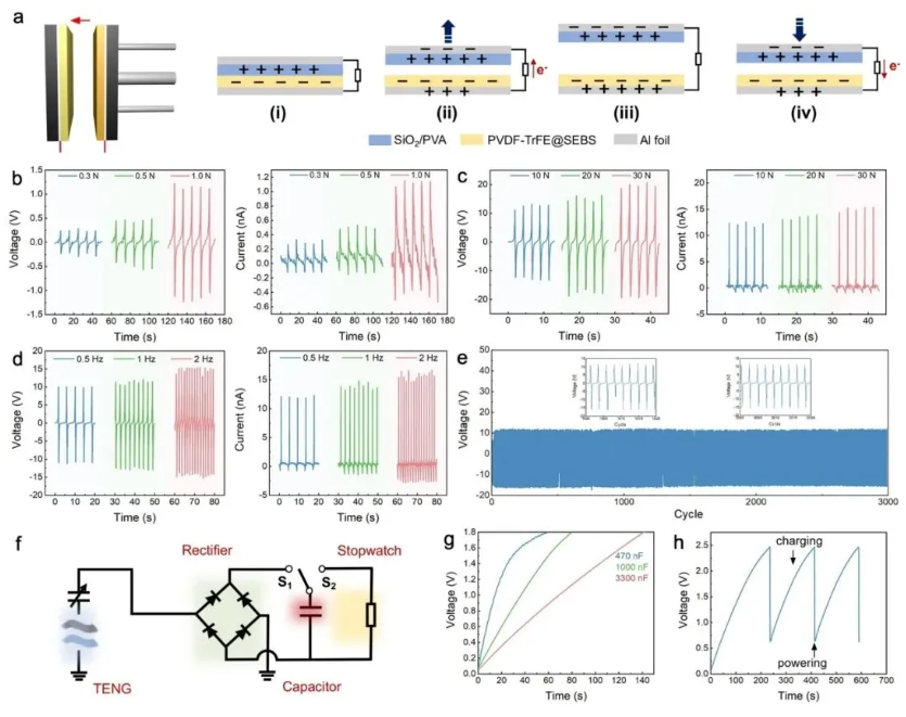 该织物在30 N压力下可输出20.3 V的电压和15.3 nA的电流(图4c),对低压力(0.3 N)和高频(2 Hz)输入信号具有良好的响应灵敏度,表现出稳定的输出性能与快速响应特性。在连续工作3000个循环后,其电输出未出现明显衰减,体现出优异的耐久性(图4e)。此外,该织物可驱动44个LED灯泡工作,并可通过整流电路为不同电容(470、1000 和3300 nF)充电,实现对秒表等低功耗电子设备的稳定供能(图4f)。