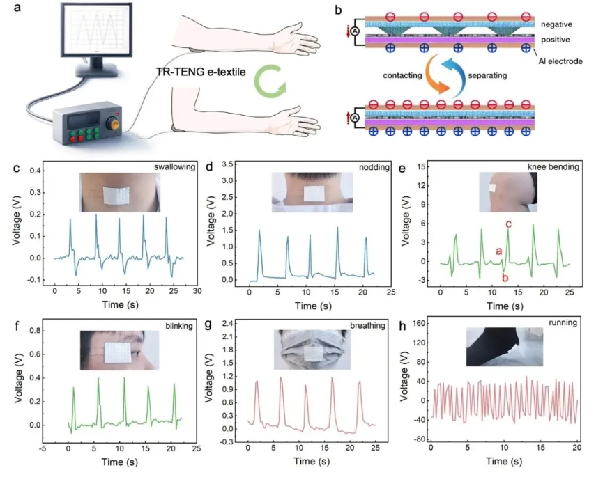 通过皮肤贴附,TR-TENG e-textile能够稳定地监测多种人体微小与大幅动作信号。如图5所示,该织物可有效监测吞咽、点头和膝关节弯曲等多种生理活动,输出信号波形清晰、可重复,且响应过程稳定,实现了零能耗下的高精度动作监测功能。