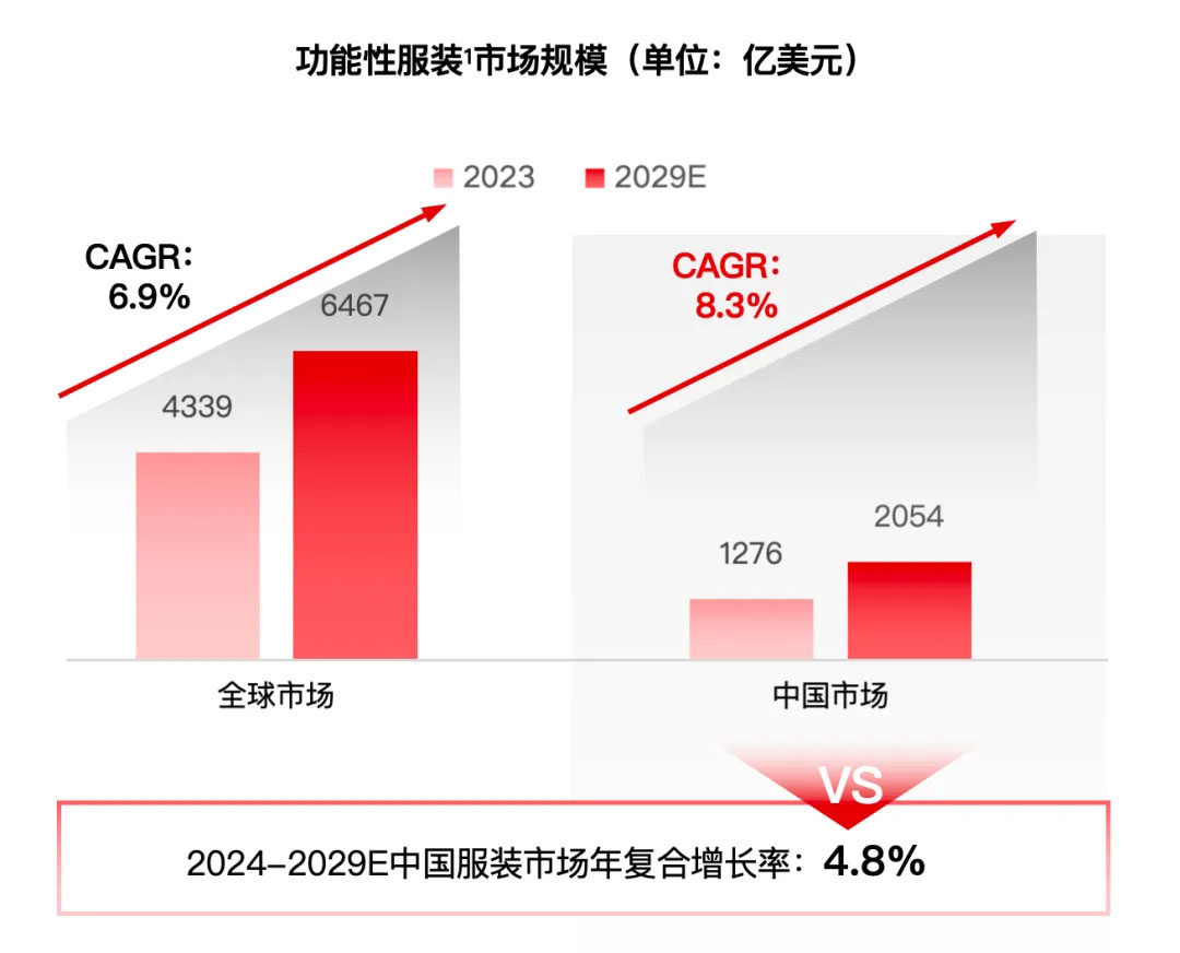 据Perry/Hope Partners统计,2023年全球功能性服饰市场规模达4339亿美元,其中,中国市场占据1276亿美元,并以8.3%的年复合增长率领跑全球。