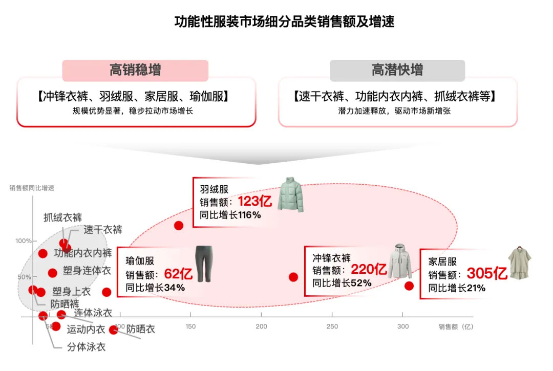 高速增长背后,是冲锋衣、羽绒服等经典品类的稳健增长,以及抓绒衣、速干衣等新兴品类的异军突起。在经典品类的“高销量”与新兴品类的“高增速”之间,市场找到了持续扩张的平衡点。