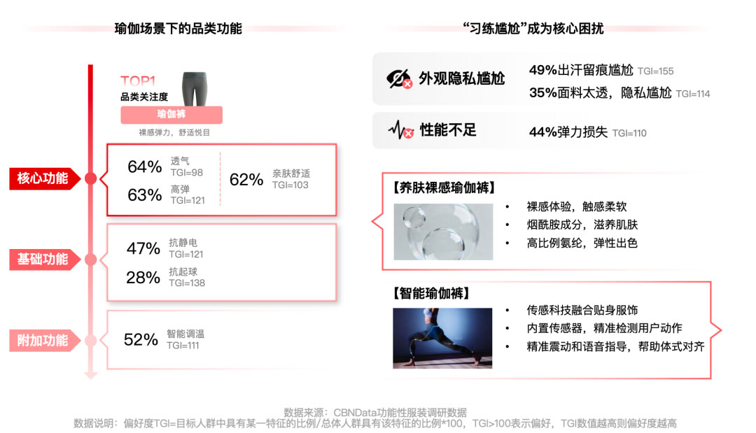 在内在探索领域,瑜伽场景的功能服饰消费将功能与美学结合,从“习练装备”转化为人们追寻生活美学的自我表达。伴随基础功能逐渐普及,瑜伽场景下的功能服饰竞争正转向对痛点的洞察与解决:汗渍留痕、隐私尴尬与弹力性能损失成为优化关键,未来,拥有裸感体验和养肤成分的养肤裸感瑜伽裤、融合传感科技和动作指导的智能瑜伽裤或成品类新风尚。