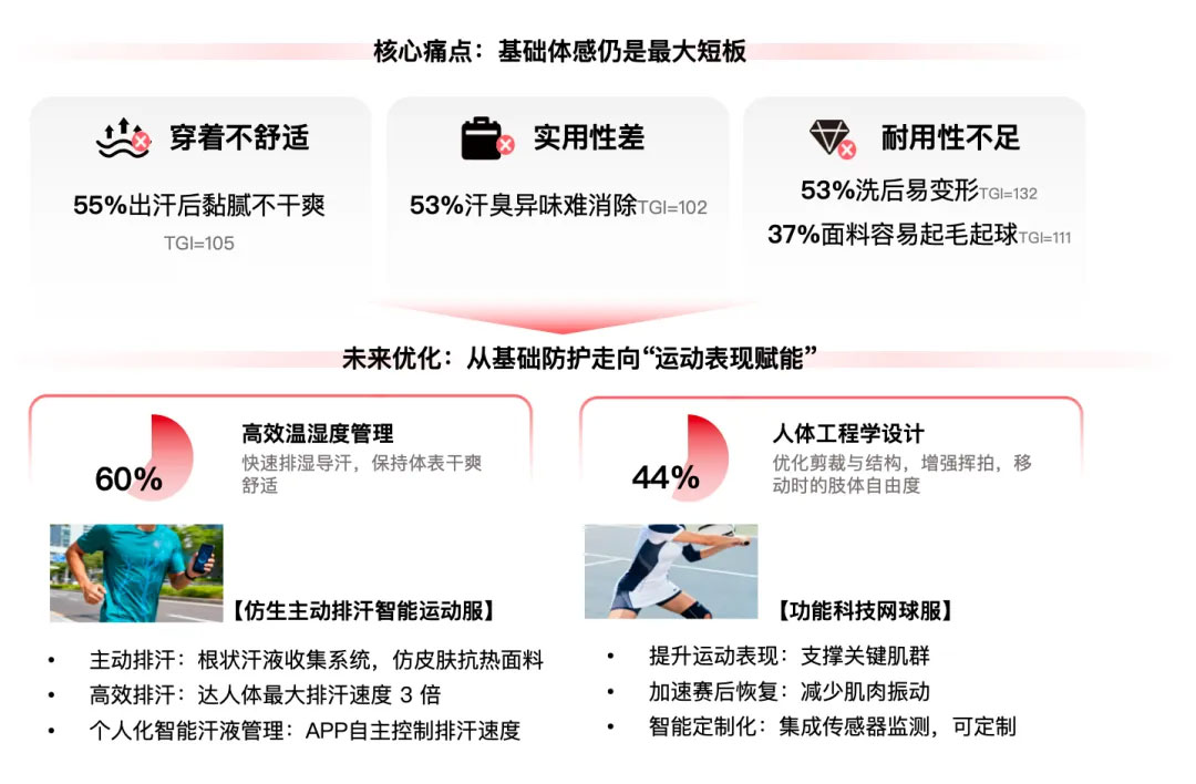 在跑步与网球场景中,功能服饰正经历从“基础刚需”向“体验升级”的转变,成为激发运动效能的“表现催化剂”。在速干衣裤、网球服等核心品类中,消费者普遍期待透气、吸湿速干、抗菌消臭、凉感等功能。未来行业竞争聚焦穿着舒适度、汗臭异味与耐用性,推动产品向高效温湿度管理、人体工学设计等方向持续迭代,以智能和功能科技重塑运动体验。