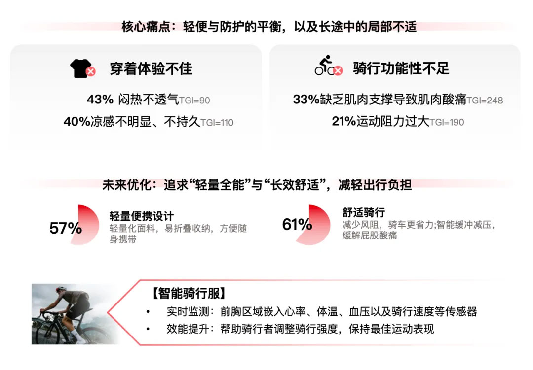 以骑行场景为例,骑行衣裤注重透气排湿、干爽随身,速干衣侧重透气舒适、干爽不闷。然而,当前许多产品仍存在闷热不透气、穿着体感不佳及长途骑行后肌肉支撑不足等功能性不足的问题。未来产品升级将更聚焦于“轻量全能”“长效舒适”等减轻出行负担的设计,能够实时监测、促进效能提升的智能骑行服或成潜在增长点。