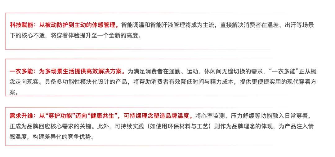 科技赋能、一衣多能、需求升维,共同描绘了功能性服饰的未来增长路径。智能调温、智能汗液管理,一键解决温差与汗湿问题;多重性能组合,让一件单品自由切换通勤、运动与休闲模式;植入心率监测与压力舒缓模块,则让服装成为可监测乃至改善身心状态的健康载体。