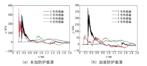 近年来,学者们通过以上方法对军用头盔的爆炸冲击波防护性能进行了研究。国内方面,张文超等基于ACH头盔进行建模,采用LS-DYNA软件模拟爆炸冲击波作用头部空气流场压力云图,结果显示,佩戴头盔可有效削弱前额、颅顶冲击波超压;因冲击波在头-头盔发生反射、透射与绕流,“过冲效应”使得颅后超压高于未佩戴头盔,冲击波正压作用时间增长;头盔的衬垫可减弱头盔对颅后防护产生超压增强的负面影响(图1)。结合ACH头盔外壳,贾时雨等采用海绵与聚脲-聚氨酯泡沫复合材料设计多种环形外沿内衬,通过激波管及外场爆炸实验表明,加装环形衬垫可使进入ACH头盔内部的冲击波压力有效衰减,且头盔与头部间隙越小,防护效果越好。康越等通过激波管测试对比裸头模与佩戴分体式/一体式半盔的情况,发现眼与耳因结构特殊易受冲击波靶向攻击(图2)。冲击波叠加汇聚会对眼与耳造成挤压与拉伸损伤,因此需加强头盔对眼与耳的防护。伍杨等通过爆炸实验评估FAST头盔及其加装防护面罩对爆炸冲击波的防护效果。实验中,1 号传感器置于参照靶标前额,2、3、4 号传感器分别置于测试靶标的前额、颅顶与颅后,结果显示,加装面罩可显著降低冲击波对前额和面部的伤害(图3)。