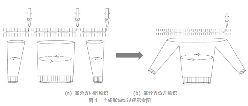 全成形工艺以智能电脑横机为核心载体,依托数字化建模技术实现织物从纱线到成品的一体化成形(图 1),不需要裁剪、缝合等工序,即可形成完整且舒适的针织产品,节约53%用工的同时,还能减少原料消耗,该成形工艺是近年来的研究热点之一。全成形工艺可精准控制UHMWPE纤维的排列方向,避免传统缝合导致的接缝应力集中,尤其适合防护头罩、防护外套等复杂制品。