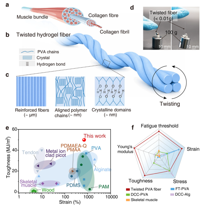 图1 | 扭转水凝胶纤维的设计理念和力学性能。(a)受天然肌肉束和胶原纤维分层结构启发的多尺度扭转纤维设计示意图。(b,c)扭转纤维展现出优异的韧性、应变耐受性和剪切强度。(d)扭转纤维可承受超过自身重量10000倍的载荷(100克砝码)。(e,f)与天然及合成软材料相比,扭转纤维在高韧性和大拉伸性能方面达到此前未及的区域,在多指标综合力学性能上表现优异。