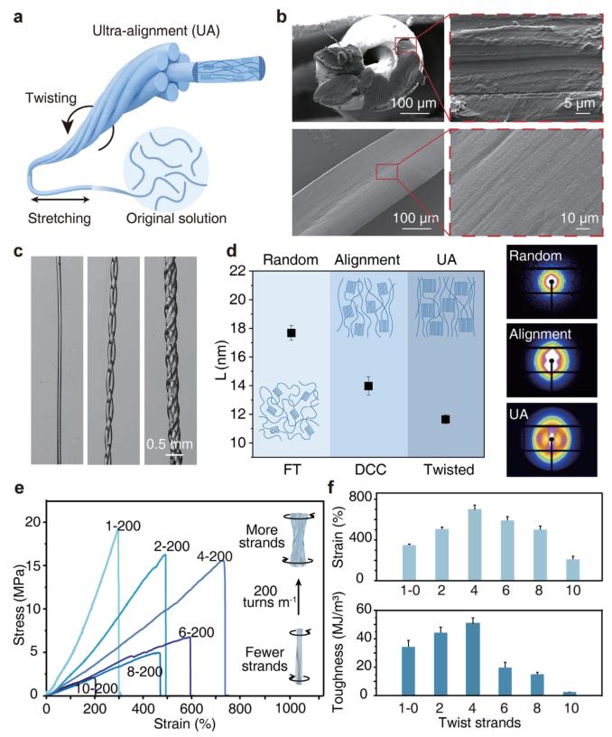 研究团队以聚乙烯醇(PVA)为模型材料,开发了“拉伸-扭转-热退火”三步法构建分层结构(图2a)。首先通过限域干燥拉伸诱导聚合物链沿纤维轴向排列,形成纳米原纤维结构;随后施加精确控制的扭转使纤维获得螺旋形貌;最后通过热退火处理在纤维内部及界面形成氢键锁定结构。扫描电镜和荧光成像显示,扭转后纤维表面出现周期性原纤维排列纹理(图2b),溶胀测试证实结构完整性得到保持(图2c)。小角X射线散射分析表明,扭转处理使相邻晶区距离缩小至12纳米,结晶度达到约35%(图2d),显著优于其他加工方法。力学测试揭示4股200捻/米是最优构型参数,该条件下纤维的拉伸强度和断裂伸长率同步提升,线性弹性区斜率最陡(图2e,f),表明结构实现了最优化的应力传递效率。