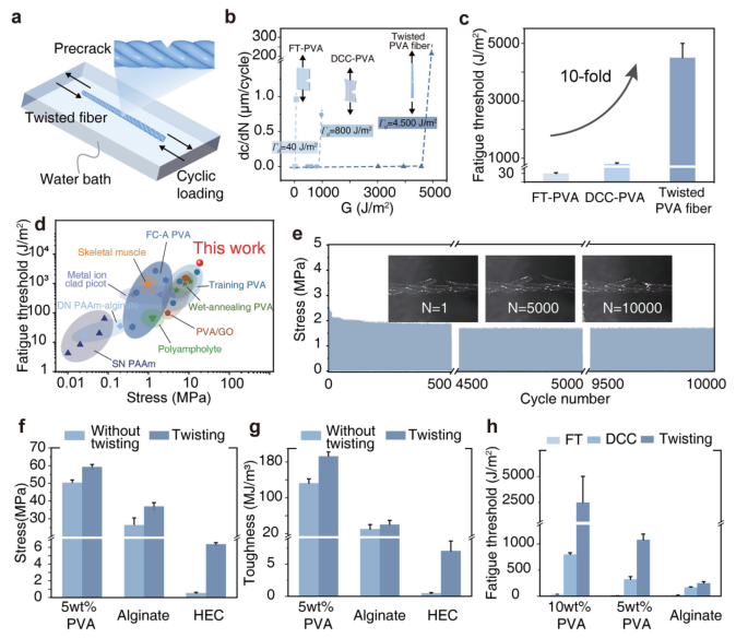 图3 | 具有扭转结构的水凝胶纤维材料的疲劳抗性 (a)测量预切口水凝胶材料在水浴中每循环裂纹扩展量对能量释放率G的示意图,以避免机械测试过程中水凝胶材料失水。(b)各类水凝胶样品(包括FT-PVA、DCC-PVA和扭转PVA纤维)的dc/dN对G曲线图。将曲线线性外推与横轴截距得到临界能量释放率Gc,定义为样品的疲劳阈值(Γ₀)。(c)水凝胶样品量化疲劳阈值(Γ₀)汇总。(d)通过绘制各种高机械性能水凝胶材料(包括聚两性电解质水凝胶(100 J/m²)、PVA/氧化石墨烯复合材料(1700 J/m²)以及生物组织如骨骼肌(约1000 J/m²))的疲劳阈值与强度对比图。(d,e)通过对预切口样品施加4500 J/m²能量释放率进行10000循环测试,验证扭转PVA水凝胶纤维样品的估算疲劳阈值。(f-h)采用相同扭转结构的5 wt.%或10 wt.% PVA纤维、海藻酸盐纤维和HEC纤维样品的拉伸强度、韧性和疲劳阈值(Γ₀)汇总,以验证我们设计和制造策略的普适性。图(b)、(c)和(f-h)数据以平均值±标准差表示,n=3。