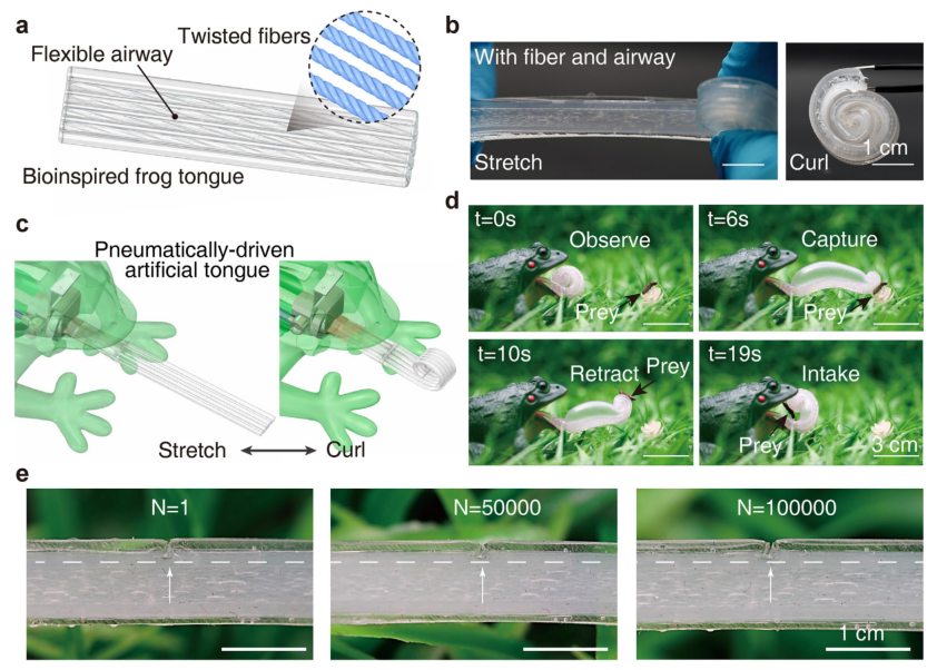 图5 | 作为蛙舌状致动器承重组件的功能展示 (a)舌状致动器的几何结构示意图,包含作为承重组件的扭转水凝胶纤维以及作为气动致动通道的气路。(b)制备好的软致动器图像,以及通过气动驱动使舌状致动器伸展/卷曲的图像。比例尺:1厘米。(c)带有气动驱动人工舌的仿蛙机器人示意图。(d)仿蛙机器人捕获猎物轨迹的快照图像。舌头通过气动驱动伸展、捕获猎物、收缩和收回猎物,整个过程在20秒内完成。比例尺:3厘米。仿蛙机器人(商业外壳)购自淘宝(中国在线市场)。图像由作者提供。(e)预切口(总宽度的1/5)人工舌在10万次(约500小时)长期形变前后的图像。比例尺:1厘米。
