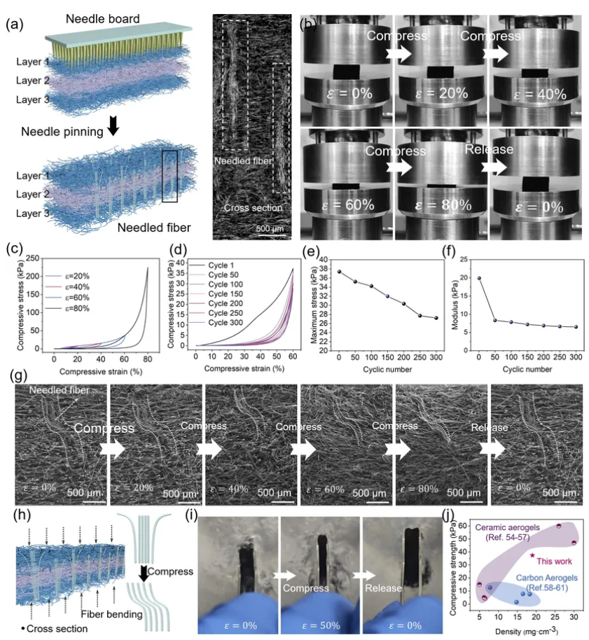 此外,CF-H通过在CF模板中引入深度针刺纤维结构,形成了坚固的类弹簧针刺纤维束网络(沿载荷方向排列),机械弹性极佳。在20%~80%的压缩范围内,其能快速回弹,即便在60%应变下循环压缩300次,仍能保持良好的力学性能,液氮的超低温环境也不会影响其压缩弹性。