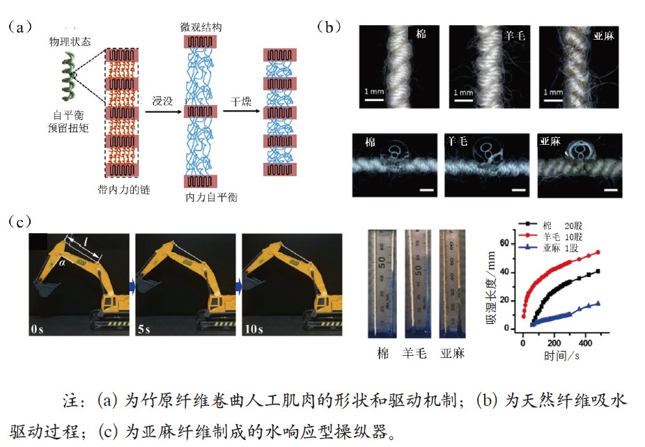 天然纤维基人工肌肉是当前备受关注的研究方向,因其材料来源广泛、生物相容性好、可生物降解以及独特的刺激响应等特性,成为构建人工肌肉的理想候选材料之一。其核心研究主要围绕材料选择、结构设计与驱动策略的协同创新展开。本节将系统梳理蚕丝、羊毛等蛋白质纤维以及竹原纤维、亚麻、棉纤维等纤维素纤维在该领域的研究现状。