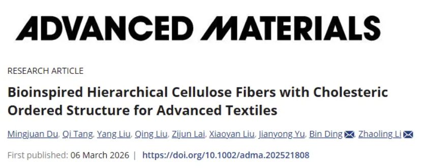 近日,东华大学李召岭研究员、丁彬教授合作,提出了一种巧妙的方法,通过引入离子液体来平衡胆甾相前驱体的粘弹性,从而实现了具有层级胆甾相有序结构(CLO纤维)的纤维素纤维的连续化制备。所得CLO纤维不仅展现出卓越的力学性能(极限拉伸应力达25.37MPa,杨氏模量达152.36MPa),还保留了胆甾相特有的光学特性,使其在先进纺织品、信息存储和生物医学等领域展现出巨大的应用潜力。相关论文以“Bioinspired Hierarchical Cellulose Fibers with Cholesteric Ordered Structure for Advanced Textiles”为题,发表在Advanced Materials上。