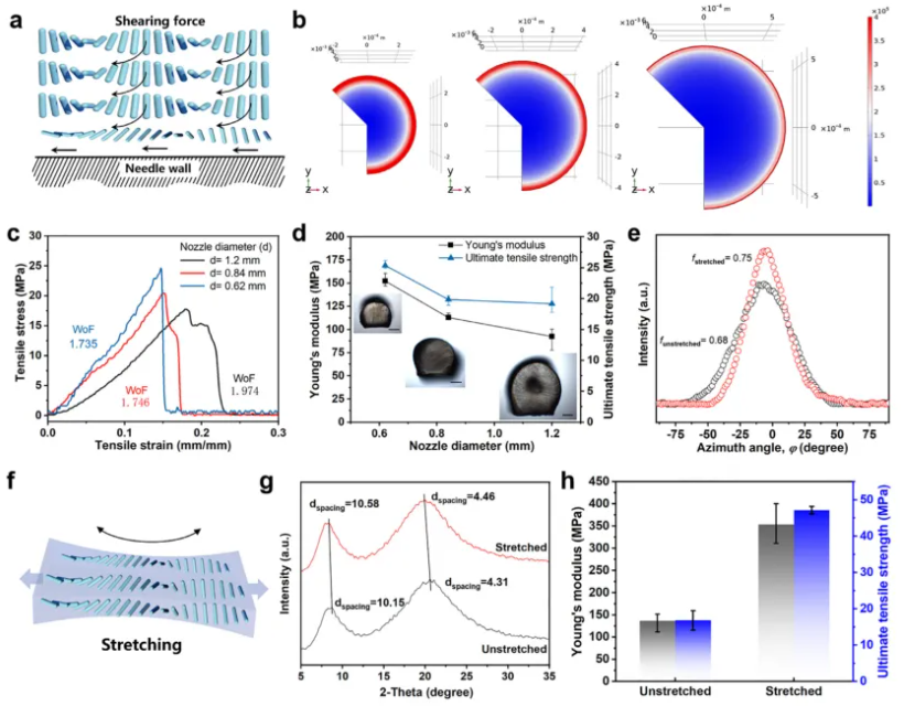 研究团队通过流体动力学模拟和精细的实验设计,深入探究了纺丝过程中的结构演变与力学性能调控机制。模拟结果显示,纺丝细流在毛细管内同时受到剪切和拉伸场的共同作用(图2a, b)。流变曲线表明,HPC胆甾相原液在剪切下存在两个剪切变稀区域,分别对应液晶畴的滑移和介晶的取向(图2c)。有趣的是,尽管剪切作用增强会导致晶体宽度减小(图2e),但纤维内部胆甾层的螺旋堆叠结构依然得到良好保存(图2d),表明胆甾排列产生的Frank弹性力使体系具有很强的抗变形能力。然而,更高的挤出速度会使液晶畴被分割成更小的亚单元,导致纤维刚度下降,断裂模式发生变化(图2f, g)。另一方面,针管壁附近的摩擦剪切力对纤维结构有显著影响(图3a)。通过减小喷丝头直径,剪切主导的区域比例增大,促使纤维形成更明显的皮-芯结构,其中皮层分子取向度更高(图3b, d)。这使得纤维直径从1.2mm减小到0.62mm时,其杨氏模量和极限拉伸强度分别提升了1.64倍和1.32倍。此外,后拉伸处理能进一步提高介晶的取向度(图3e, f),导致相邻晶域间距和分子层间距增大(图3g),从而显著提升纤维的模量和强度(图3h)。