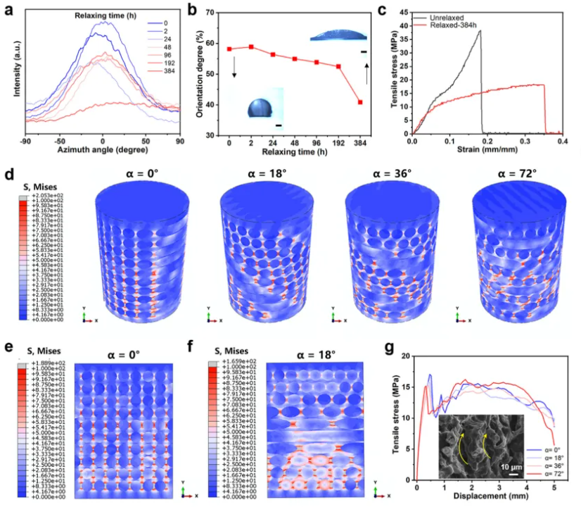 图4 | CLO纤维结构和力学性能随松弛时间的变化,以及CLO纤维的有限元模拟分析