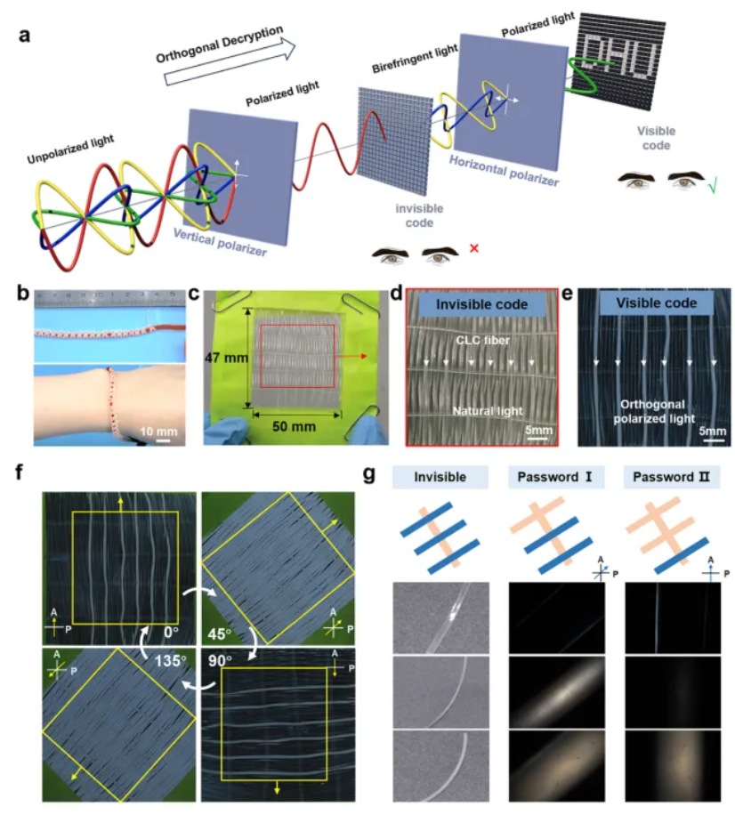 基于CLO纤维独特的偏光特性和优异的力学性能,研究团队探索了其在光学加密和智能纺织品领域的应用。CLO纤维在偏光显微镜下不出现消光现象,而传统纤维则会在平行或垂直于偏光片方向时变暗。利用这一差异,可以将信息加密进由CLO纤维编织的图案中(图5a)。在自然光下,由商业TPU纤维和CLO纤维共同织成的织物(图5c)视觉上毫无区别,隐藏的条纹信息不可见(图5d);而在交叉偏振片下,CLO纤维编织的部分则亮起,实现信息的解密(图5e)。利用不同材料(如各向同性的PVA膜、TPU纤维和CLO纤维)对偏振光的不同响应,还可以设计出更复杂的多级加密系统,需要不同的偏振条件才能逐层解密出完整信息(图5f, g)。这种方法不仅易于读取,而且基于纤维素纤维的生物可降解性和可回收性,也为开发环保型光子平台提供了可持续的方案。