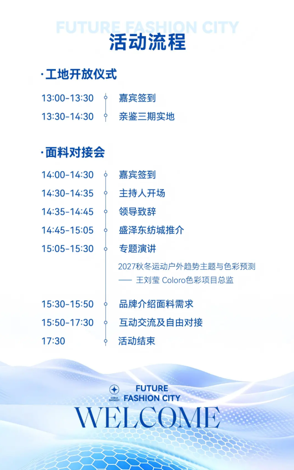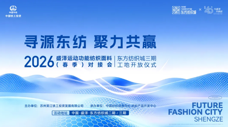 这一浪潮之下,如何让优质功能面料精准触达品牌采购商、实现产业链各环节高效联动,成为纺织产业集群纵深发力的重要命题。3月30日,2026盛泽运动功能纺织面料(春季)对接会暨东方纺织城三期工地开放仪式将在吴江区盛泽镇举行。活动将以“寻源东纺·聚力共赢”为主题,为盛泽面料企业与国内服装品牌搭建起精准对接、深度洽谈、高效合作的桥梁,助力产业链上下游协同发展。