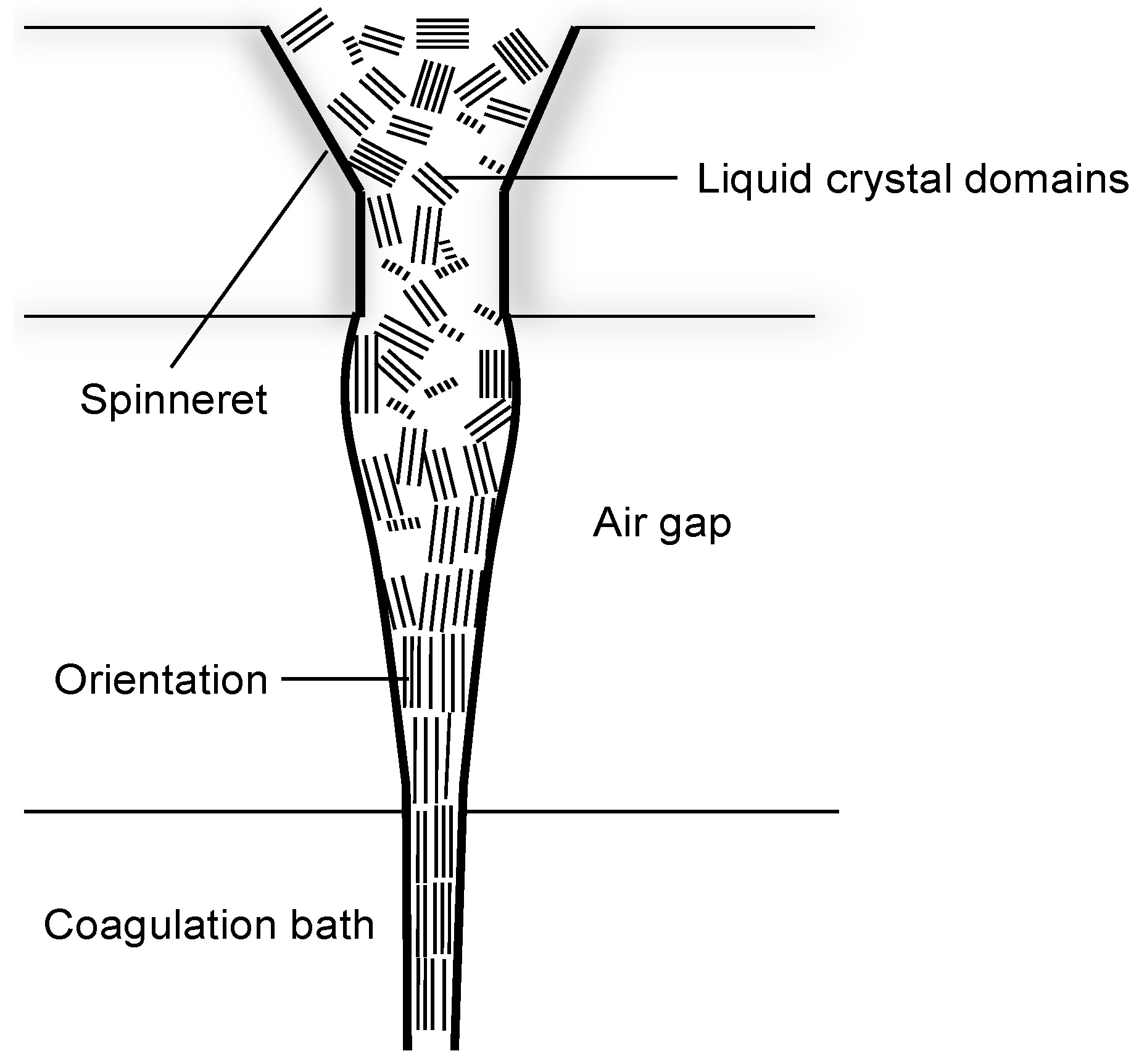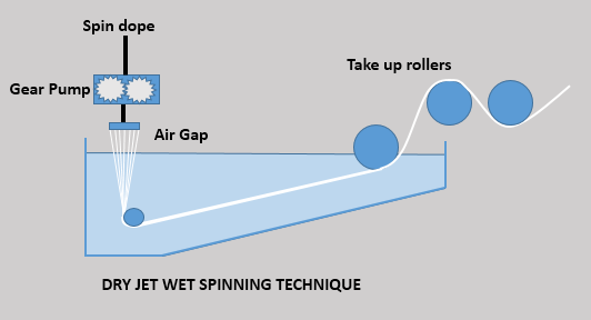 干湿法纺丝与湿法纺丝的不同仅在于:纺丝原液从喷丝孔喷出进入凝固浴之前,经过一段空气层。空气层的存在使初生纤维的结构发生很大的变化,液态丝条在进入凝固浴前,在空气层中被牵伸成分子结构取向。由于具有高度取向结构,干湿纺纤维的强度比相同条件下得到的湿纺纤维要高。