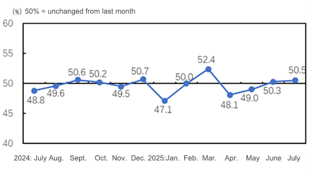 Regarding the sub-index, in July, the raw material purchasing index was 49.9%, 1.9 percentage points lower than in June; the raw material inventory index was 48.9%, down 3.0 percentage points month-on-month; the production index was 50.0%, down 0.1 percentage points from June; the product sales index was 51.5%, increasing 1.8 percentage points month-on-month; the product inventory index was 50.4%, up 2.0 percentage points from the previous month; and the business index was 51.0%, up 0.6 percentage points from June.