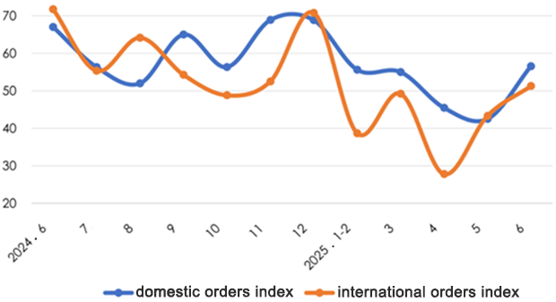 According to the Association’s research on key member enterprises, in the first half of 2025, the domestic and international order indexes of the technical textiles industry reached 56.6 and 51.3, respectively (Fig. 2), and the Sino-US trade negotiations stabilized market expectations; the capacity utilization rate of industry enterprises generally stayed around 70%; these companies also sped up the phase-out and upgrading of old equipment. According to data from the National Bureau of Statistics, the output of nonwovens enterprises above a designated size reached 3.31 million tons from January to June 2025, a 4.5% increase year-on-year, with 730,000 tons exported, up 12% year-on-year; the output of cord fabric (in tires) reached 511,000 tons, decreasing by 0.3% year-on-year.