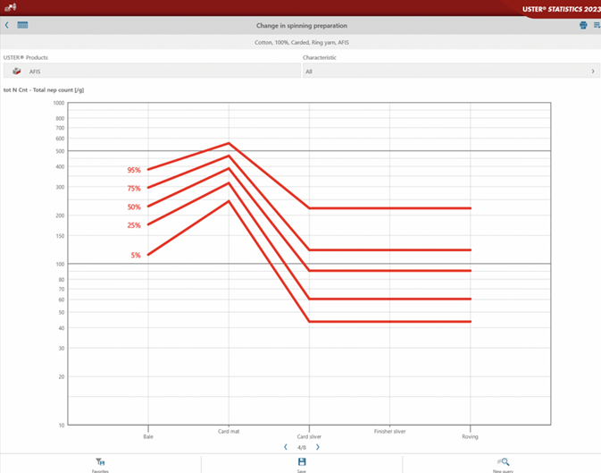 The processing charts in Uster Statistics track the fiber quality characteristics. Key parameters for neps, short fibers, and impurities are plotted through each processing stage. The accompanying graphic shows the typical increase in neps in the blowroom from bale to card mat, followed by a decrease after carding as neps are removed. Spinning mills can compare their own levels against the global standard. This allows a quick assessment of the situation, identifying areas of overperformance or potential improvements.