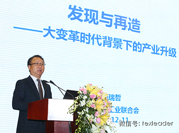中国纺织工业联合会副会长孙瑞哲作了题为“发现与再造——大变革时代背景下的产业升级”的主题报告,他从宏观经济形势与政策的高度,全面分析总结了我国纺织产业发展的内外部环境。他指出在新常态下产业竞争优势的重塑与再造有赖于行业企业的技术创新、模式创新以及思维创新,他还就三个维度的创新方向提出了具体的指导意见。