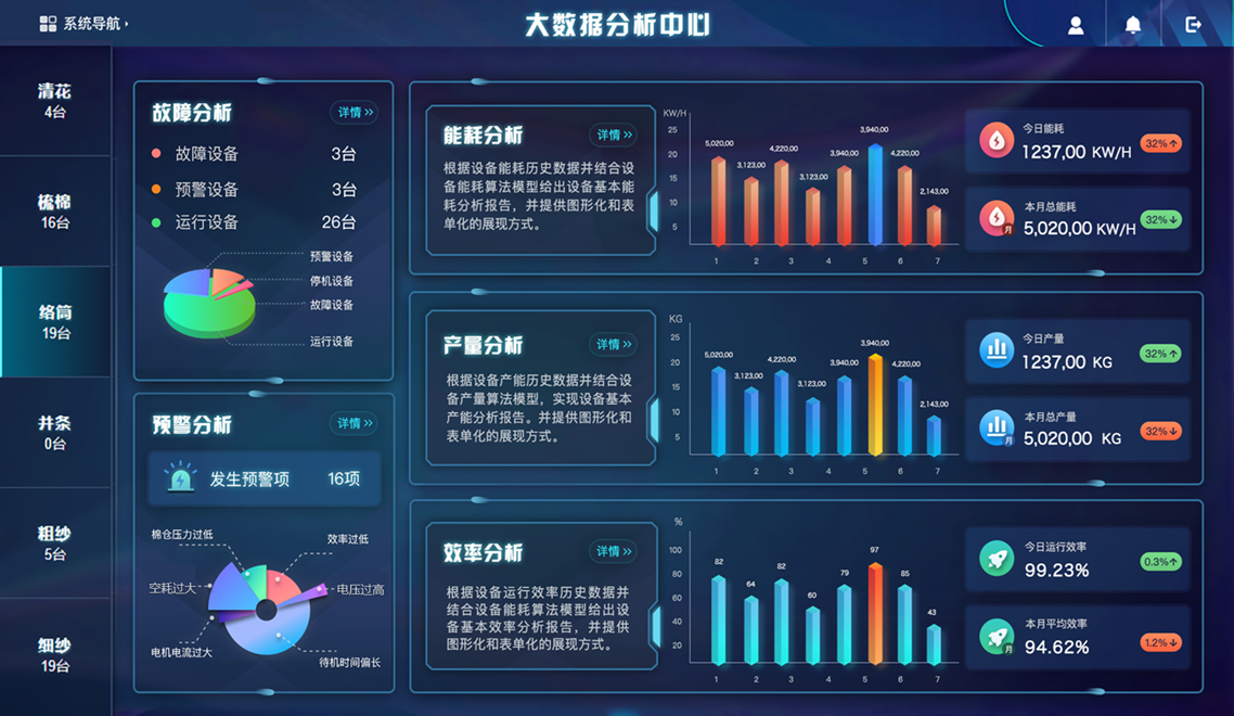 青岛宏大远程运维系统是为应对纺纱企业在技术人员流失、优化设备管理、提升生产精准化管理、实现工厂信息化等方面需求而研发的新一代纺纱管理系统,采用大数据技术平台、物联网采集平台、高可用时序数据库等多项先进技术,提供多种解决方案,能够多方位满足各类客户的需求。