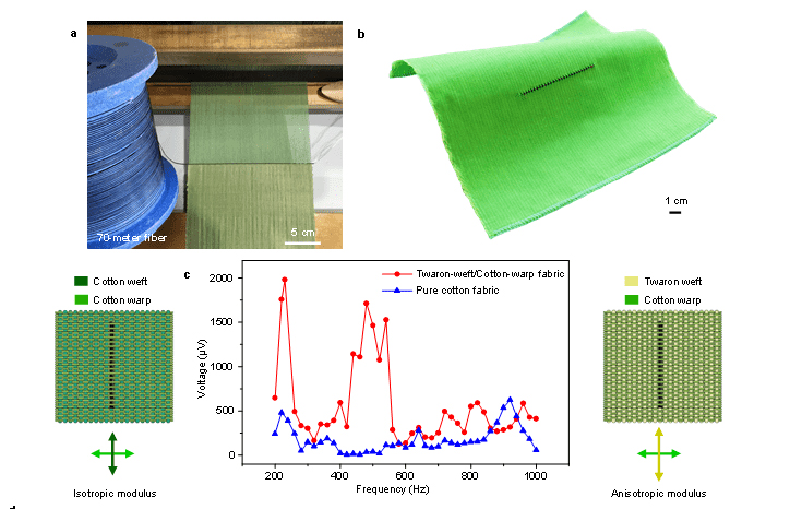 为制备高灵敏度的声学织物,研究者设计了由棉纱(经向)和高模量Twaron长丝(纬向)交织的机织物,并以同样规格的纯棉织物为对照,将热拉纤维直接编织到织物基体中。最终发现,Twaron/棉织物的声学响应要远远高于纯棉织物,在相同声音频率下,Twaron/棉织物具有低阶机械振动模态,其诱导纤维产生更高的振动幅度,并只向一个方向发生弯曲变形。而且,经过10次机洗循环后,依旧能保持其电学特性和声学特性。