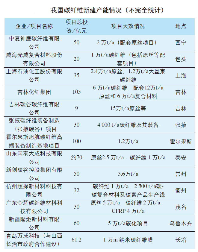 历经30年的徘徊和20余年的发展,我国碳纤维制备与应用技术取得了重大突破。据统计,2021年我国碳纤维总产能已超过6.3万t/a,并形成中复神鹰、恒神、威海拓展、钢科碳材料、国兴碳纤维、上海石化、宝旌炭材料、新创碳谷、福维高性能碳纤维、中安信科技、蓝星纤维、中简科技、方大江城、凯美克、郝氏炭纤维等一批大中小型企业。2020年 8 月,我国碳纤维行业首次实现盈利并出现供不应求的局面,有实力的厂家大规模扩大产能,一批新进企业投入巨资兴建综合性碳纤维项目。