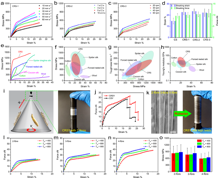 为解决这一问题,浙江理工大学研究团队创造性地开发了一种多模式、快速离心抽丝的方法,制备出了高强、高模、高韧蚕丝(CRS)。该方法的抽丝速度可达自然吐丝的6倍以上,收集的CRS具有优异的断裂强度,可媲美蜘蛛丝。