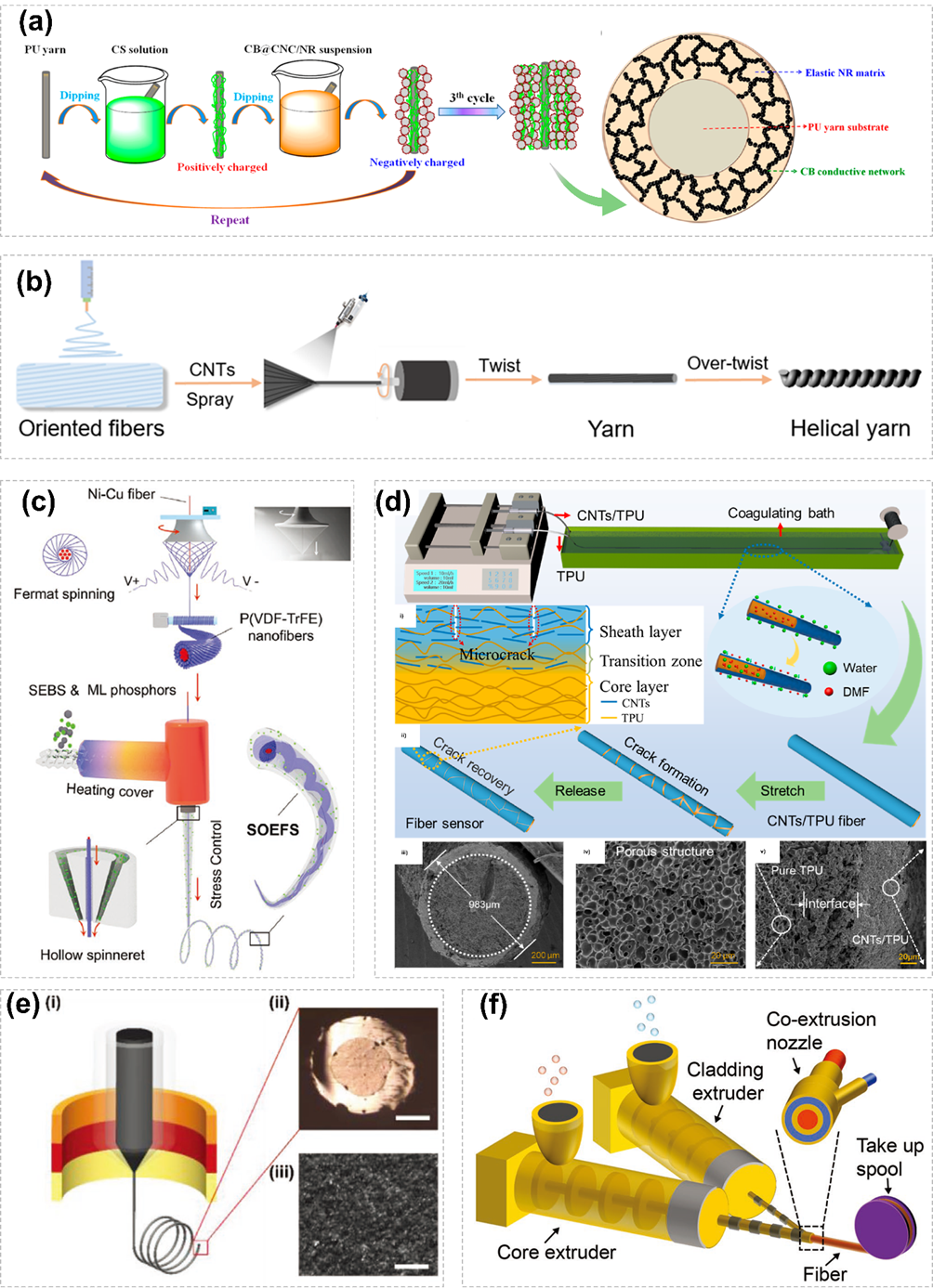 首先,研究人员介绍了1D纤维/纱线的制造技术,包括浸涂、喷涂、辊涂、气相沉积和原位化学生长在内的涂层技术,熔融纺丝(直接纺丝和挤出纺丝)和溶液纺丝(静电纺丝、干法纺丝和湿法纺丝)在内的纺丝技术,以及热拉伸和热挤出成型技术。