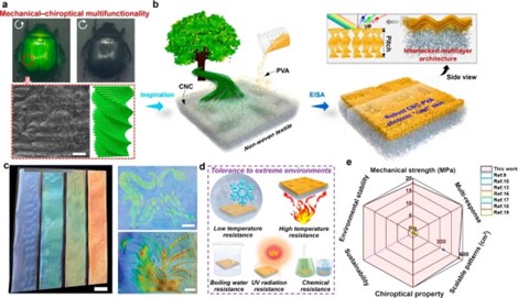 受自然界中生物体稳定光-机械多功能性启发,武汉纺织大学徐卫林院士团队从废弃纸浆板中提取纤维素纳米晶作为功能光子染料,通过一步组装方法,大规模制备极端环境稳定的米级光子织物。