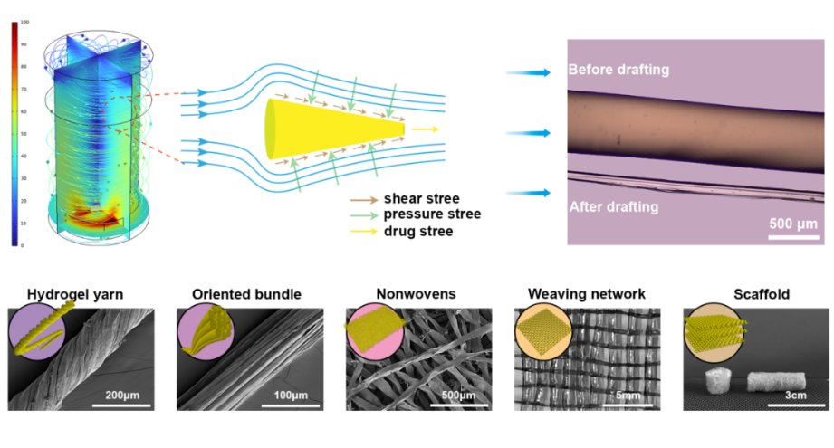 水凝胶纤维具有水凝胶的性能特点以及纤维的结构优势,受到研究者的广泛关注。兼容各种传统加工策略的水凝胶纤维可以有效构建一维、二维、三维产品,在生物医用领域具有极大的应用前景。然而,由于水凝胶的三维网络结构特性及较弱的力学性能,无法通过机械牵伸的方法制备小直径的水凝胶纤维,这极大限制了水凝胶纤维的应用研究。因此,亟需一种高效且适用范围广的方法,用于规模化制备直径可控、力学性能优异的水凝胶纤维。