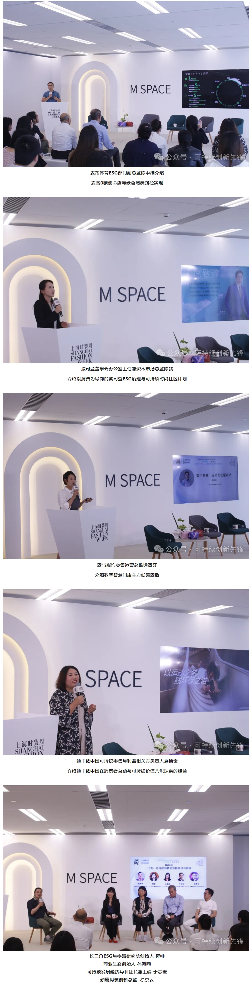 中国纺联社会责任办公室副主任胡柯华开启绿色门店主题分享,随后作为中国市场在可持续消费领域活跃的参与者代表,安踏体育、波司登、森马服饰、迪卡侬中国分别分享了各自品牌在可持续消费的最佳实践案例。