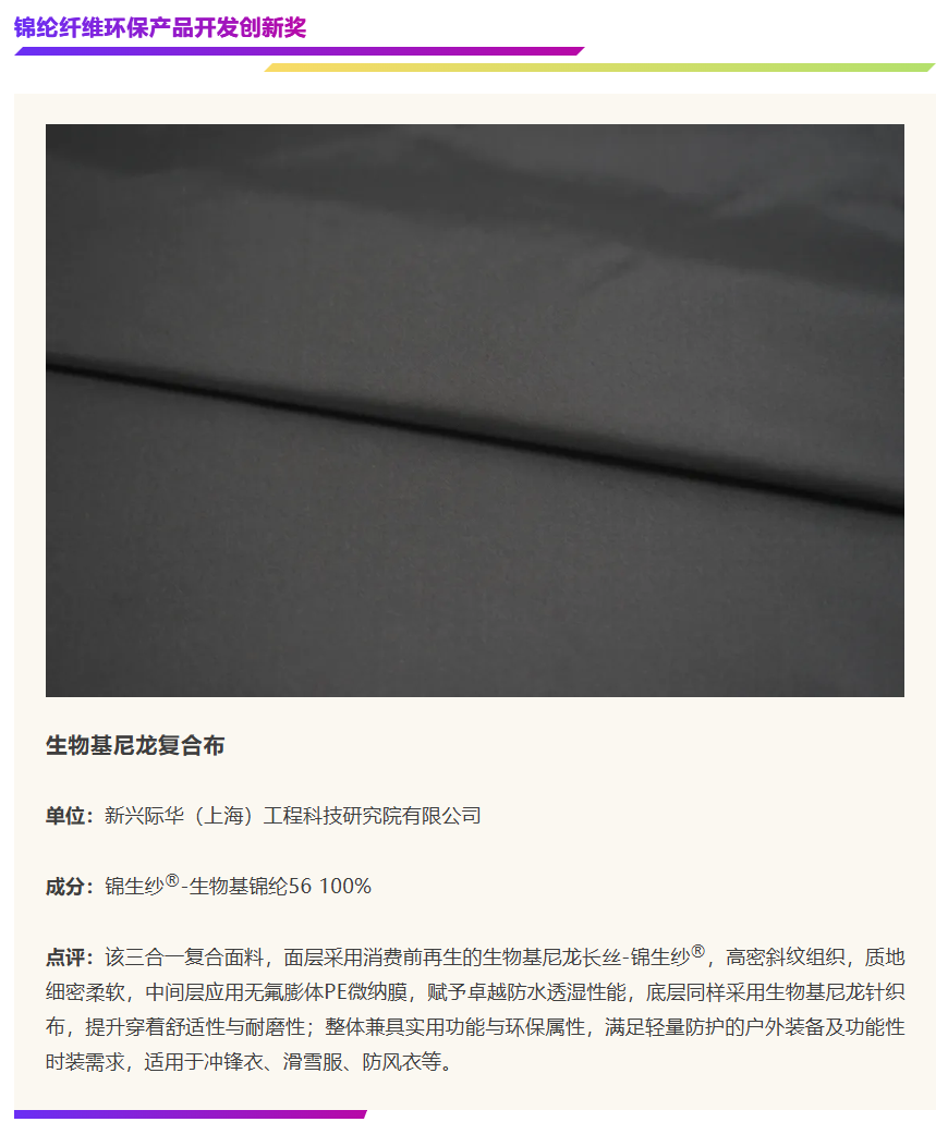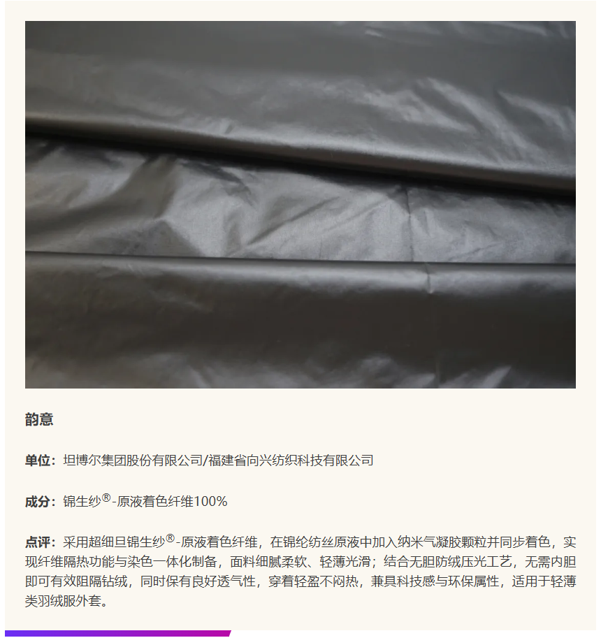 在中国国际面料设计大赛与福建永荣锦江股份有限公司携手设立的“锦纶(永荣锦江)产品开发应用奖”中,锦纶面料在技术创新研发、绿色可持续生产、时尚创新设计等关键维度,展现了锦纶企业的前沿开发实力,为纺织市场注入了无限活力。本期内容将通过解读六款获奖产品,深入探索锦纶在面料开发中的更多创新方向,解锁锦纶应用新可能!