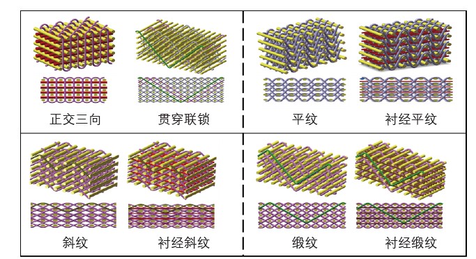 三维织物增强体是采用三维编织、三维机织等工艺制成的整体织物。典型的三维编织结构包含了 4 组空间倾斜交织的纱线,称为三维四向编织结构,在该结构中可以通过引入伸直的轴向纱线来提高织物的轴向性能,获得三维五向、三维六向和三维七向编织结构(图 1)。典型的三维机织结构有两种,一种包含了 3 组空间相互垂直相交的纱线,称为正交三向机织结构;另一种包含了两组分别沿经向和纬向排列且层间联锁交织的纱线,称之为层间联锁机织结构,或经纱贯穿织物整个厚度,称之为贯穿联锁机织结构。典型的层间联锁机织结构中多层经纱和纬纱之间的交织规律为类平纹结构,经纱弯曲会导致材料经向性能降低,因此可通过引入伸直的衬经纱,提高织物的经向性能,同时也可以将交织规律设计为类斜纹、类缎纹等结构提高材料的经向性能。各类三维机织增强体结构如图 2 所示。