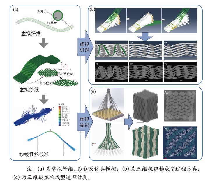三维织物增强体的纱线交织结构由其织造工艺决定,其纱线截面形态、空间分布路径等均受到织造工艺参数的显著影响。因此,一种由工艺驱动的三维织物增强体结构设计方法得到了迅速发展。在该结构设计方法中,假设高性能纤维丝束由虚拟纤维丝构成,每根虚拟纤维丝代表若干根真实的纤维单丝,且体积相同。每根虚拟纤维假设为一根柔性链,由微小纤维单元构成,每个纤维单元由杆单元和空心梁单元组合而成。如图3(a)所示,虚拟纤维丝组成虚拟纱线,通过模拟织造工艺过程形成虚拟织物。图3(b)给出了三维机织物成型过程仿真及其虚拟织物结构与试样织物结构的对比情况。通过对织造工艺过程的数值仿真,获得了三维机织物的虚拟结构,与真实织物的CT扫描图对比可知,虚拟织物结构中纱线排列、纱线路径和截面形态等均准确地再现了试样织物的真实交织结构,是现实织物的数值化高保真模型。采用同样方法获得了三维编织物的数值化高保真模型,如图3(c)所示。