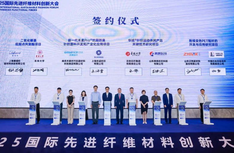 聚焦产业链上下游的协同创新,本次大会举行了11个重点项目签约仪式,覆盖低碳材料研发突破、纺纱技术创新、功能性面料升级、人工智能赋能制造等关键方向。