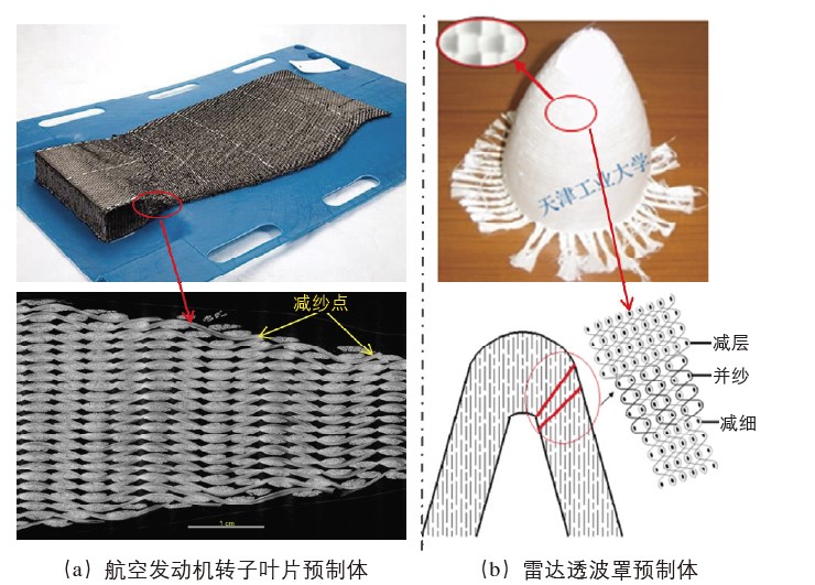 三维机织工艺主要分为直线坐标纱线体系的正交织造与极坐标纱线体系的径向织造两类。其中,正交织造适用于高厚度平板结构、块体结构以及具有变截面几何特征的预制体成型;径向织造则适用于回转体、截锥体及非旋转对称异形管状预制体的制造。为实现预制体截面参数(厚度/直径)的梯度变化,需采用动态加/减纱工艺实现。层间联锁机织结构凭借其层间交联的特性,在加/减纱工艺中展现出优异的适应性 —— 局部纱线增减不会影响整体结构的完整性。典型应用:航空发动机转子叶片预制体通过定向经纱减层实现了榫部(厚50 mm)至叶缘(厚0.5 mm)的厚度梯度演变;雷达透波罩预制体则通过周向经纱增列满足了顶端到底端直径的连续变化,如图所示。需强调的是,纱线加/减纱位点的设计对结构完整性有决定性影响,设计失当将诱发纱线屈曲、树脂富集等缺陷,影响最终复合材料构件的力学性能。