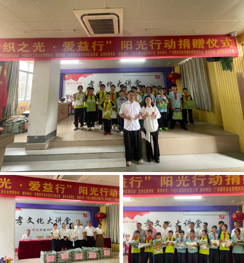 儿童是民族的未来,教育是国之根本。纺织行业作为关系国计民生的支柱产业,不仅承载着经济价值,更肩负着推动社会进步、传递人文关怀的使命。在此背景下,宁波久耀服饰有限公司携手纺织之光科技教育基金会与中国纺织工业企业管理协会开展的“纺织之光·爱益行”关爱下一代公益捐赠活动,从华东出发,跨越千山万水,将来自纺织服装行业的关爱与温暖传递至甘肃庆阳、广西宜州的孩子们手中,以实际行动诠释了纺织行业企业对我国儿童成长与教育事业的深切关怀,共同绘制了一幅温暖人心的社会责任画卷。