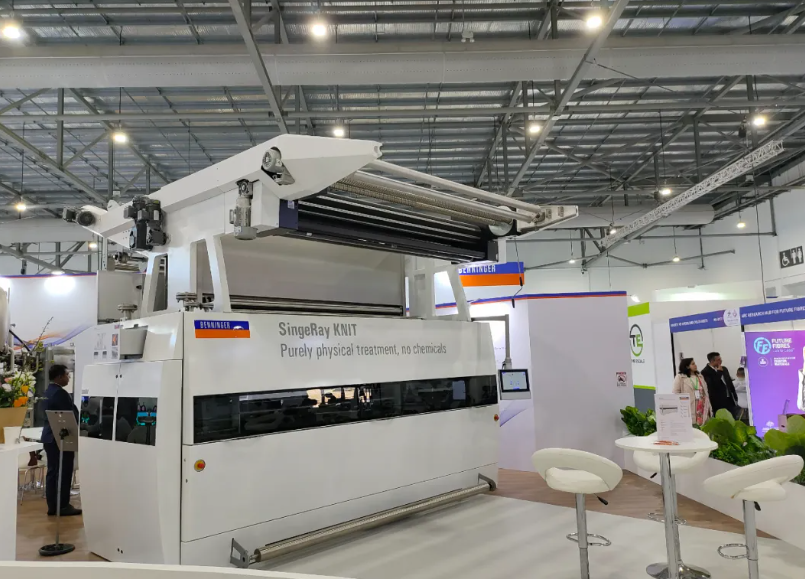 Benninger的物理烧毛技术有效契合了这一趋势,其采用纯物理方式,通过燃气火焰烧除织物表面细微绒毛,获得平滑、无毛且具光泽的织物外观,真正实现了“无水、无化学品、低废弃、低成本”。贝宁格SingeRay烧毛机为针织物品质升级提供了理想选择,同时彻底消除生物抛光环节。与酶处理相比,其原料利用率更高、环境影响更小。粉尘经湿式除尘系统分离,单台设备日产能高达30t。