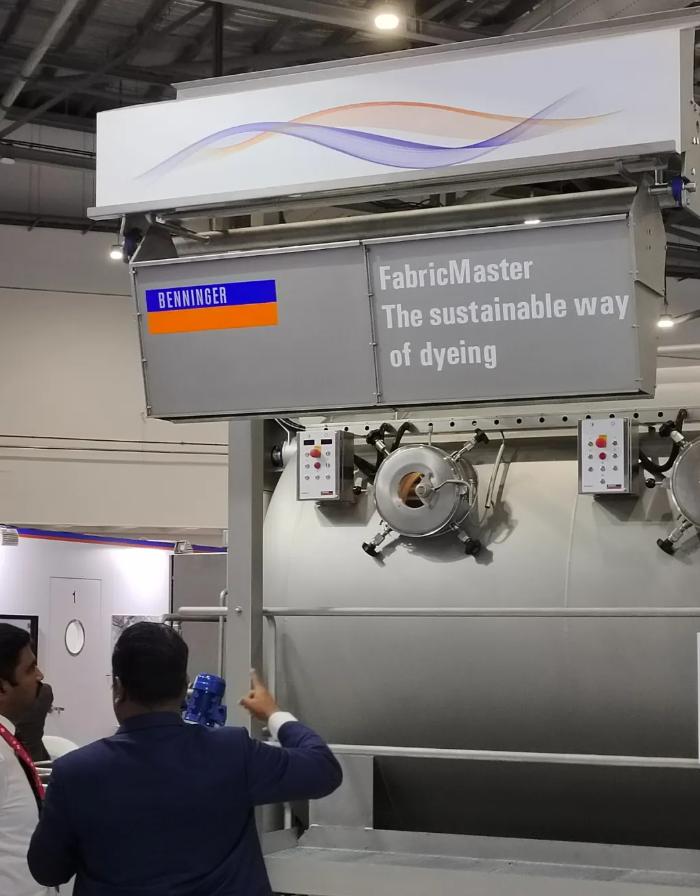 Benninger展示的FabricMaster喷射染色机以其高效、灵活、经济的性能成为业内最受关注的间歇染色设备。该设备兼具高强度结构与智能节能设计,以“完美织物品质”为理念,可在极低用水量与成本条件下实现多种织物类型的染色,是喷射染色领域的新标杆。它适用于各类纤维与织物,具备平稳高效的布料输送、顺畅的液流循环、高效的渗透性能及短周期染色等特性,实现资源的合理利用与优异的染色均匀性。