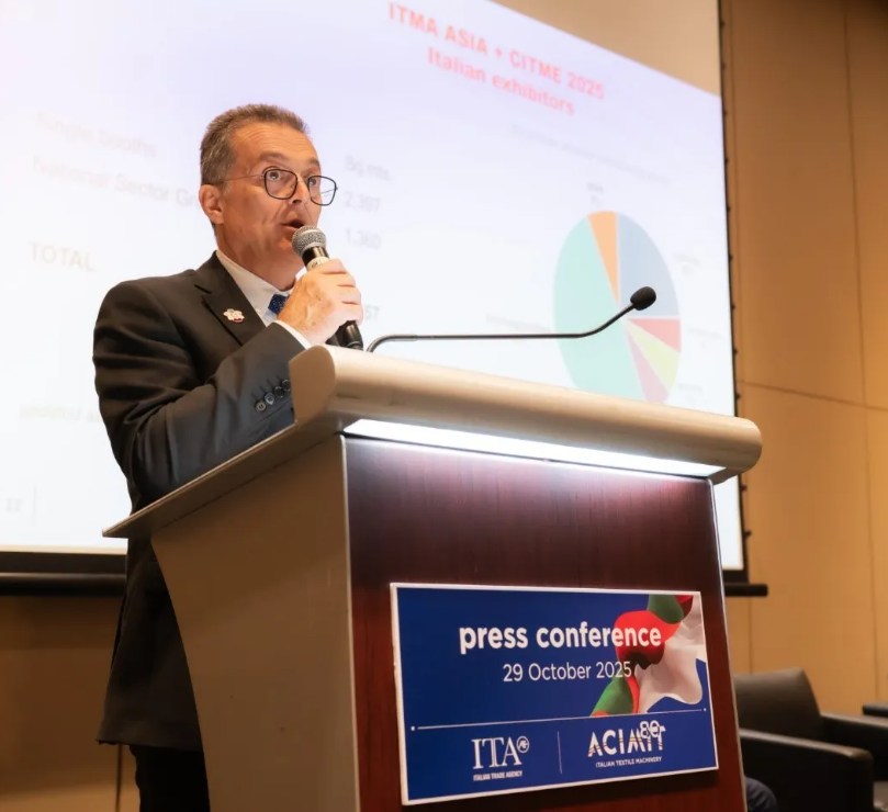 展会期间,ITA和ACIMIT召开新闻发布会,ACIMIT主席Marco Salvadè介绍了意大利纺机行业2024年以来的运行情况及在重要出口市场的表现。据透露,2024年意大利纺机行业产值约21亿欧元,出口额达18亿欧元,企业300余家,从业人员1.25万人左右。亚洲是意大利纺机最重要的海外市场,2024年,意大利纺机对该地区的出口额为6.64亿欧元,2025年上半年达3.17亿欧元,同比增长1%;2025年全年来看,预计中国、印度、土耳其和美国将是其最重要的出口市场;放眼2026年,预计对印度、埃及和越南的出口额将保持积极增长。